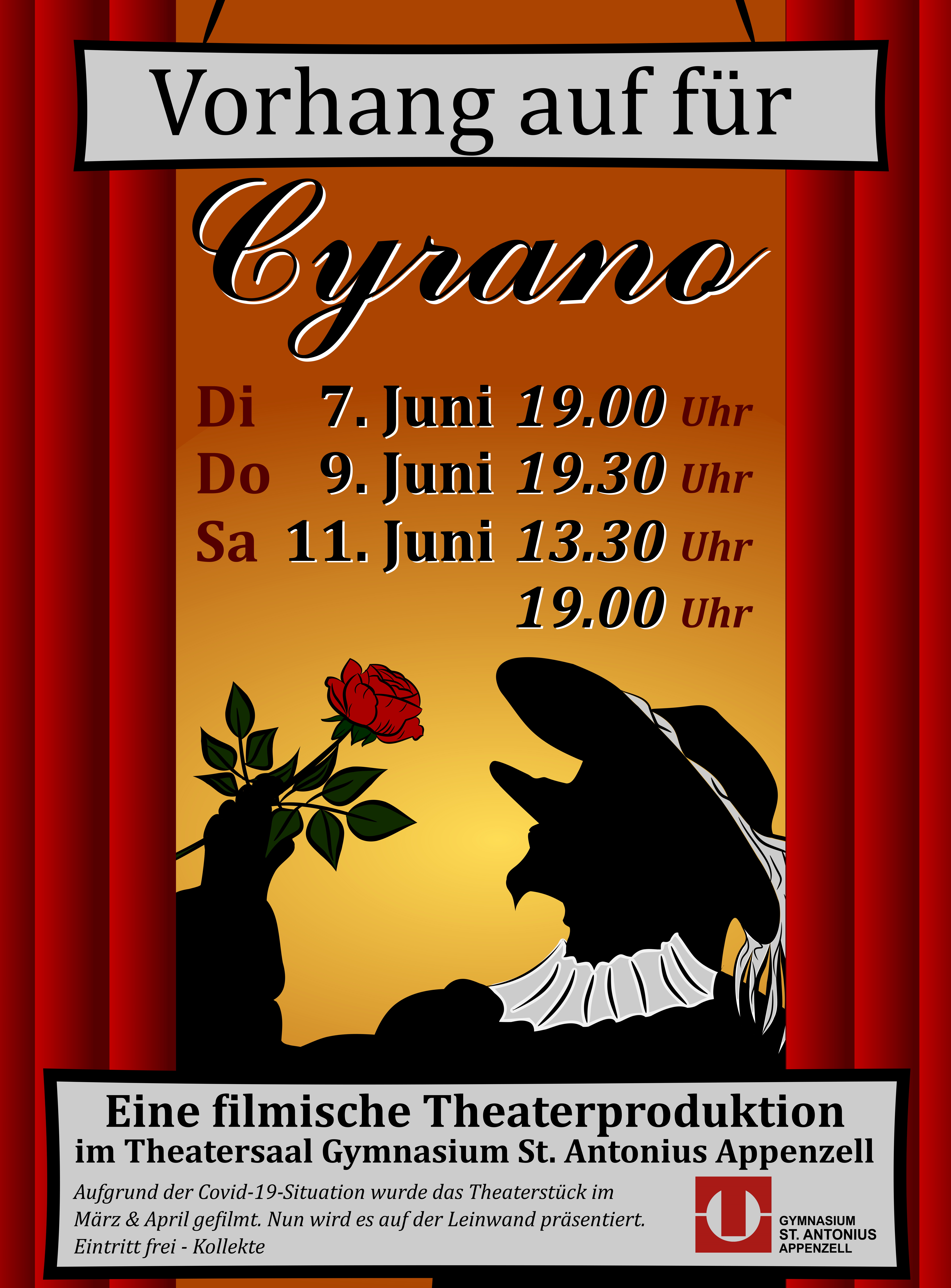 Nachdem zwei Jahre keine Theateraufführungen haben stattfinden können, dachte man sich am Gymnasium St. Antonius Appenzell, «Vorhang auf für Cyrano», als Theater über das Theater, sei das geeignete Stück, um wieder mit einer Produktion auf die Bühne zurückzukehren. Es kam anders. Die Proben liefen, man kam gut voran und arbeitete bereits an den Details, als die Aufführungen doch noch abgesagt werden mussten. Gemeinsam entschied man sich aber, den Vorhang nicht einfach fallen zu lassen, sondern das Theater über das Theater in einer filmischen Theaterproduktion festzuhalten. Konkret heisst das, das Stück «Vorhang auf für Cyrano» wurde gefilmt.